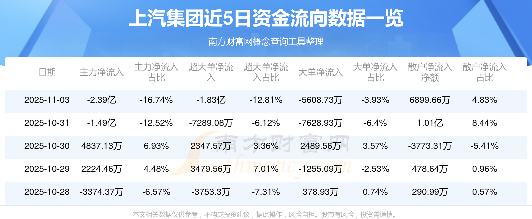 11月3日消息,上汽集团主力资金净流出2.39亿元,超大单资金净流出1.83亿元,散户资金净流入6899.66万元。