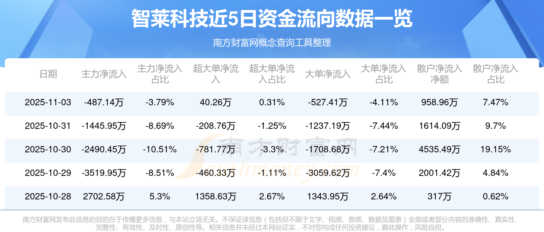 11月3日消息,智莱科技主力净流出487.14万元,超大单净流入40.26万元,散户净流入958.96万元。