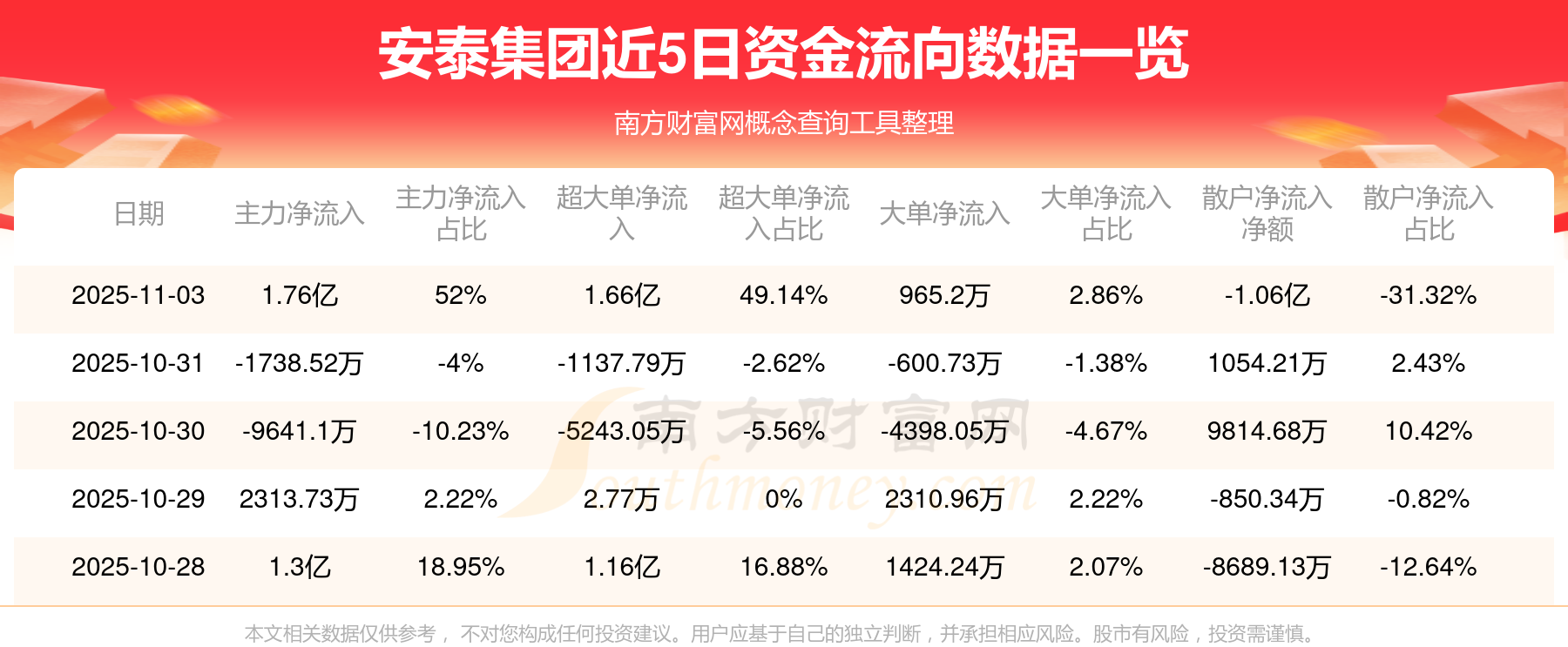 11月3日消息,安泰集团主力资金净流入1.76亿元,超大单资金净流入1.66亿元,散户资金净流出1.06亿元。