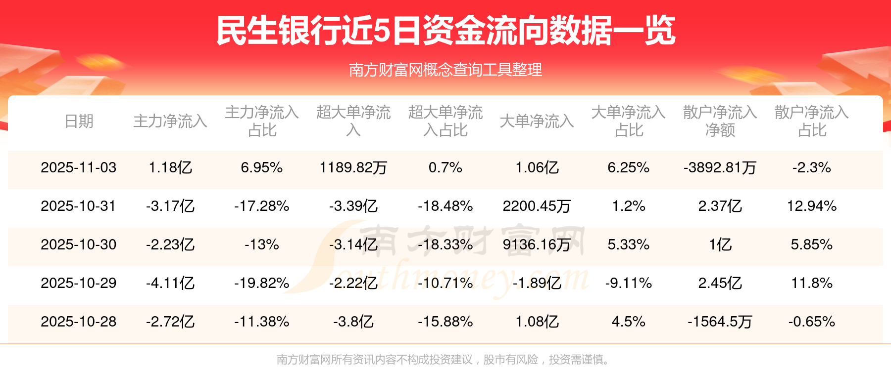 11月3日消息,民生银行11月3日主力净流入1.18亿元,超大单净流入1189.82万元,大单净流入1.06亿元,散户净流出3892.81万元。