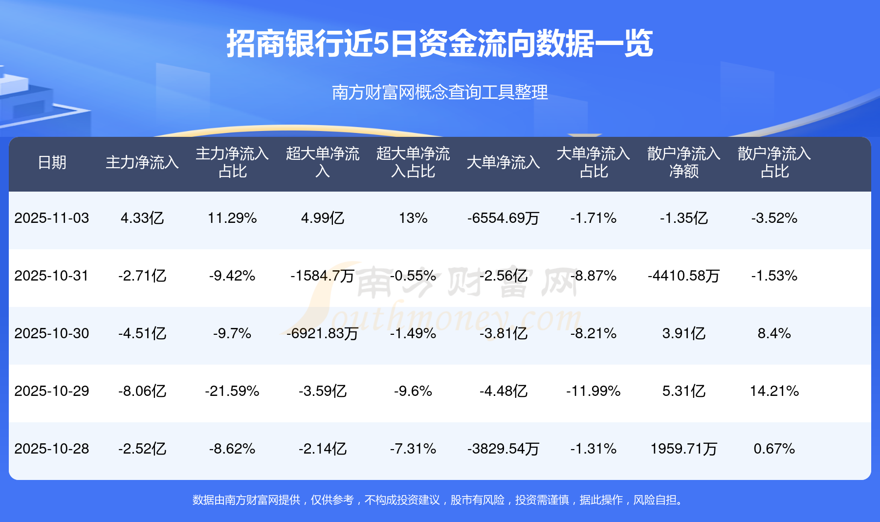 11月3日消息,招商银行主力净流入4.33亿元,超大单净流入4.99亿元,散户净流出1.35亿元。