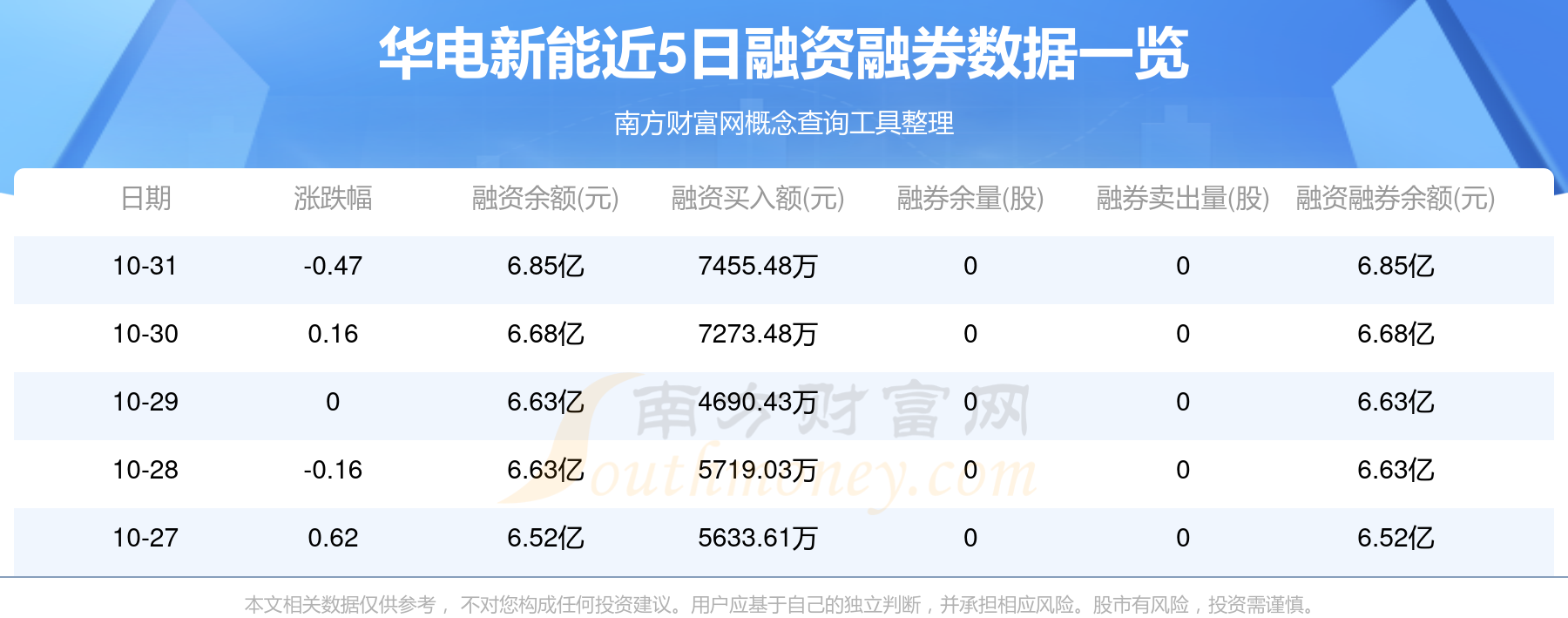 10月31日华电新能融券信息显示,融资方面,当日融资买入7455.48万元,融资偿还5784.69万元,融资净买额1670.79万元。近5日融资融券数据一览见下表: