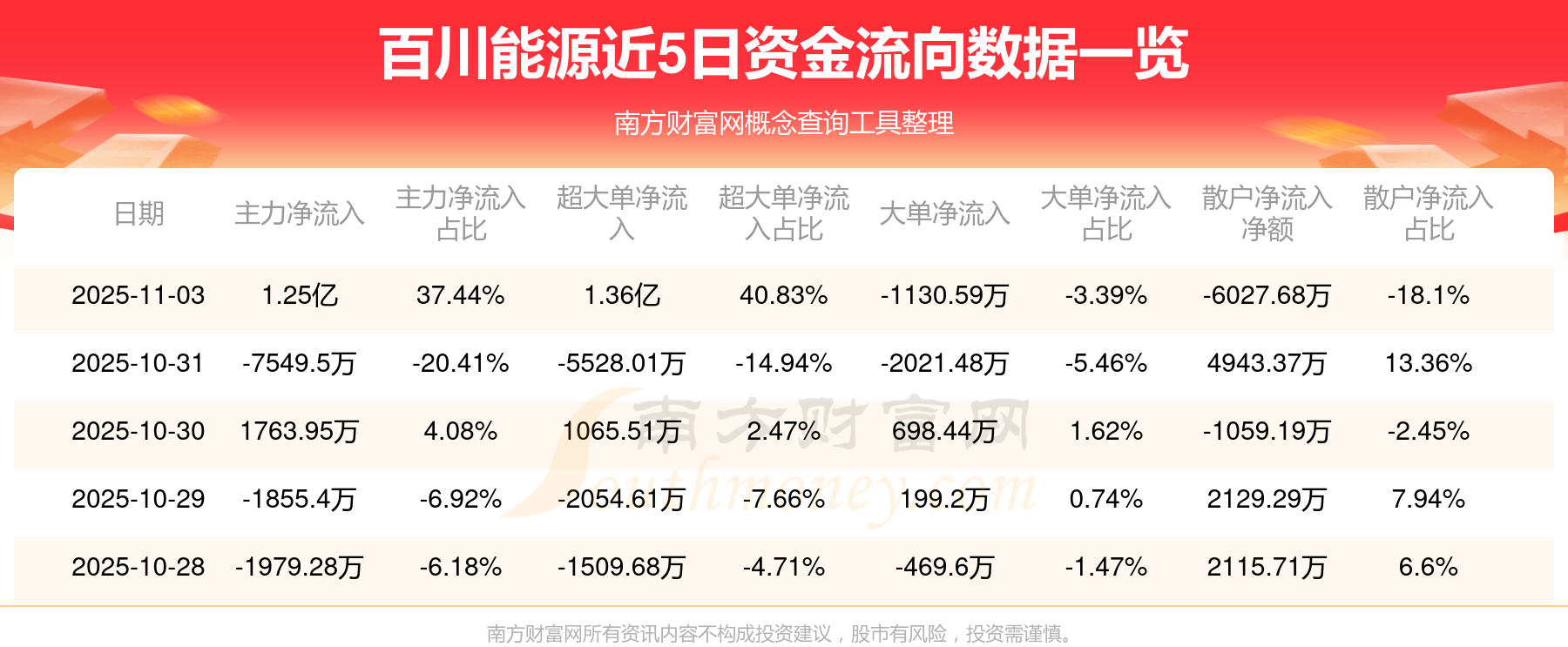 11月3日该股主力净流入1.25亿元,超大单净流入1.36亿元,大单净流出1130.59万元,中单净流出6441.39万元,散户净流出6027.68万元。