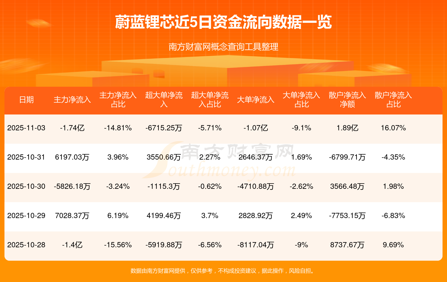 11月3日消息,蔚蓝锂芯11月3日主力资金净流出1.74亿元,超大单资金净流出6715.25万元,大单资金净流出1.07亿元,散户资金净流入1.89亿元。