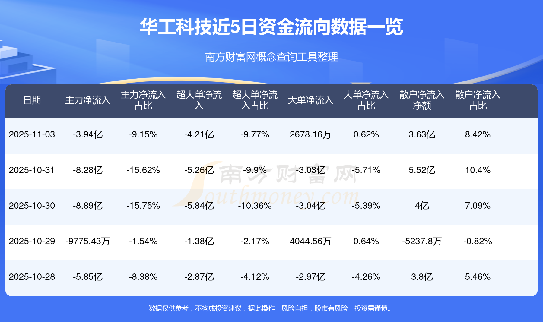 11月3日消息,华工科技主力净流出3.94亿元,超大单净流出4.21亿元,散户净流入3.63亿元。