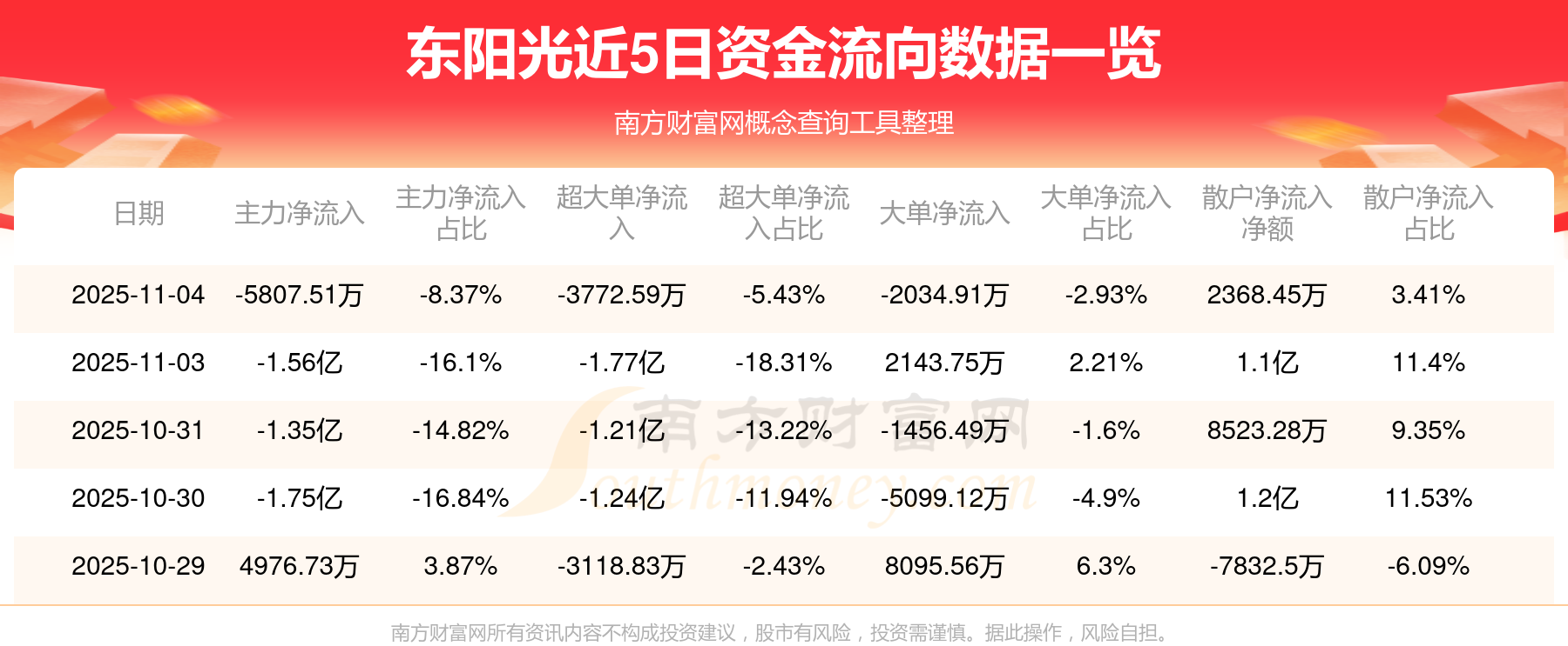 11月4日消息,东阳光主力资金净流出5807.51万元,超大单资金净流出3772.59万元,散户资金净流入2368.45万元。