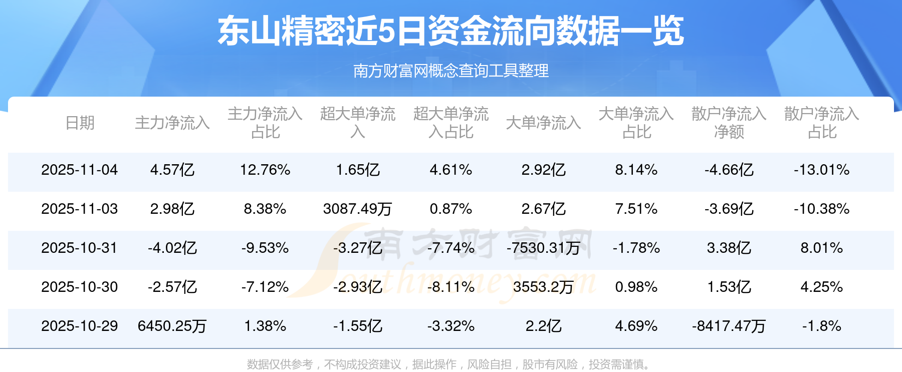 11月4日消息,东山精密主力资金净流入4.57亿元,超大单资金净流入1.65亿元,散户资金净流出4.66亿元。