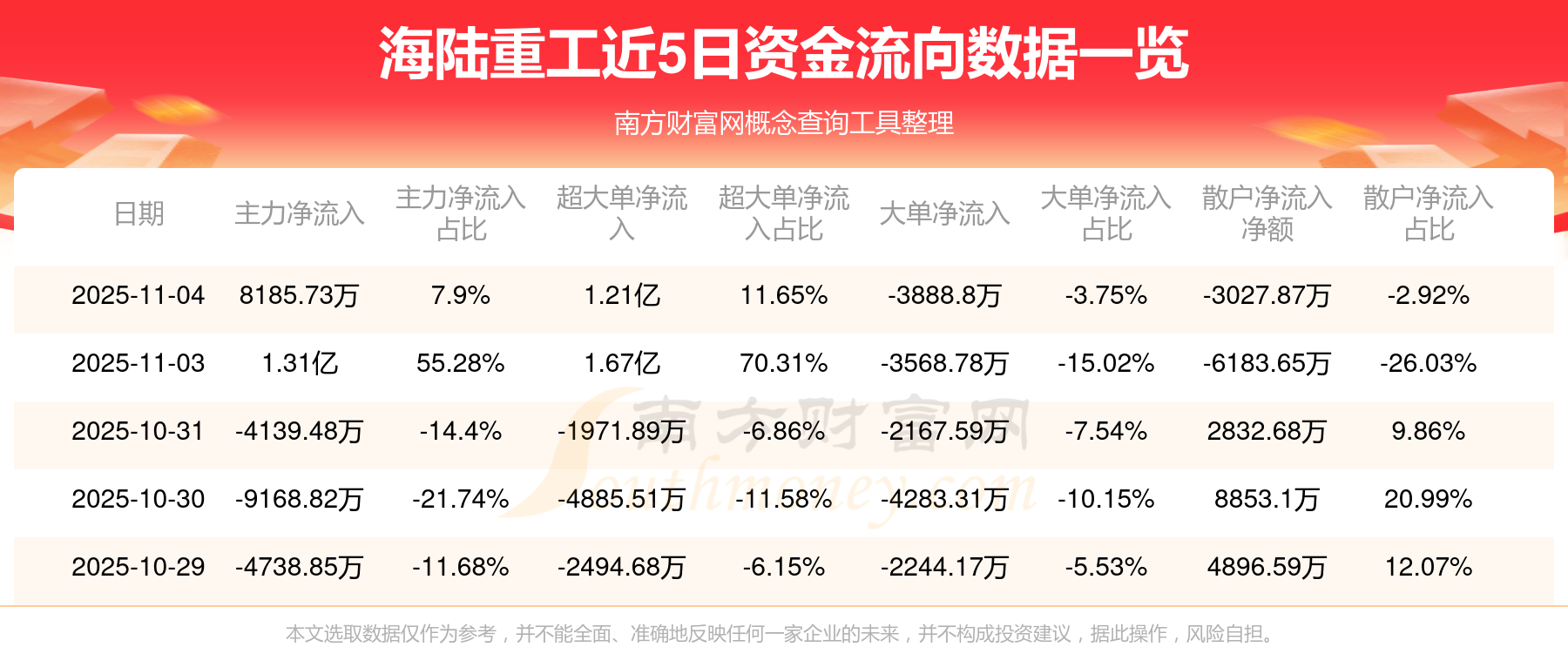 11月4日消息,海陆重工11月4日主力净流入8185.73万元,超大单净流入1.21亿元,大单净流出3888.8万元,散户净流出3027.87万元。