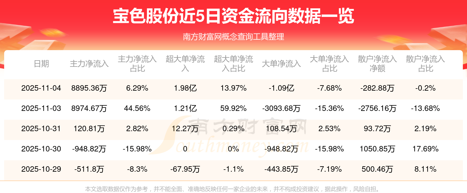 11月4日消息,宝色股份主力资金净流入8895.36万元,超大单资金净流入1.98亿元,散户资金净流出282.88万元。