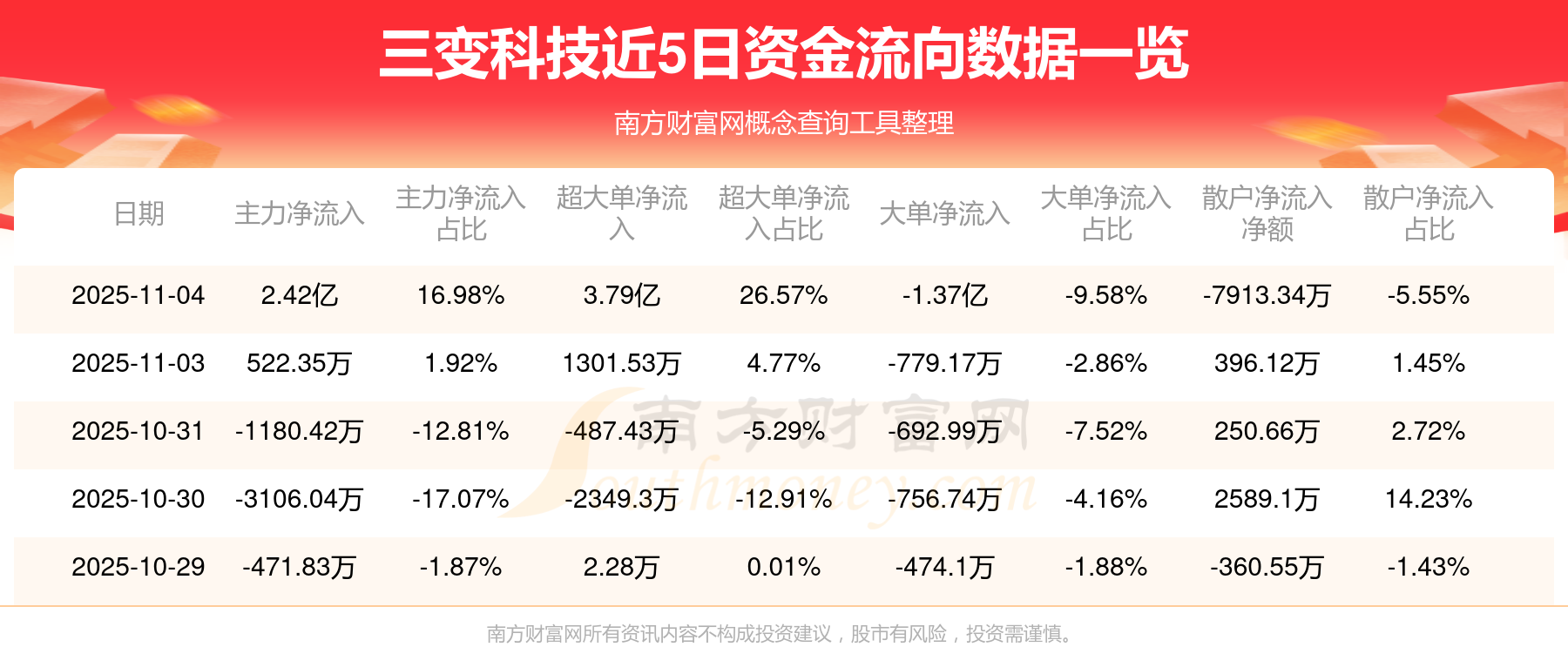 资金流向数据方面,11月4日主力资金净流流入2.42亿元,超大单资金净流入3.79亿元,大单资金净流出1.37亿元,散户资金净流出7913.34万元。