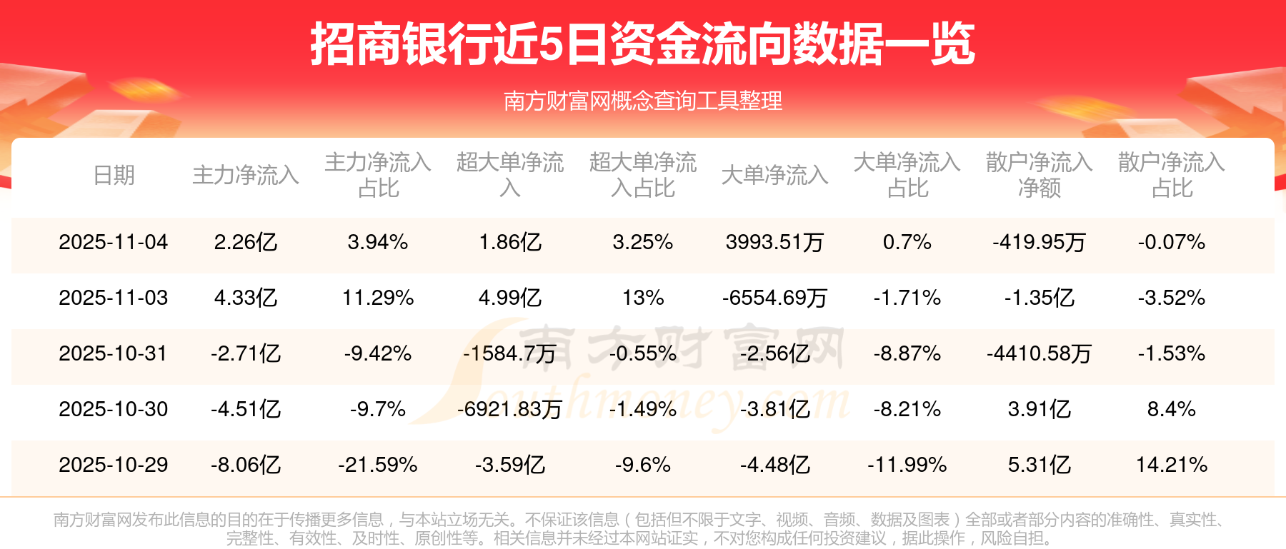 11月4日消息,招商银行主力资金净流入2.26亿元,超大单资金净流入1.86亿元,散户资金净流出419.95万元。