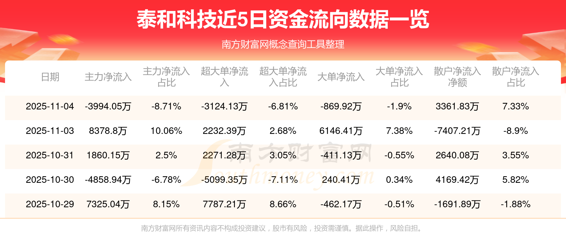 11月4日消息,泰和科技主力资金净流出3994.05万元,超大单资金净流出3124.13万元,散户资金净流入3361.83万元。