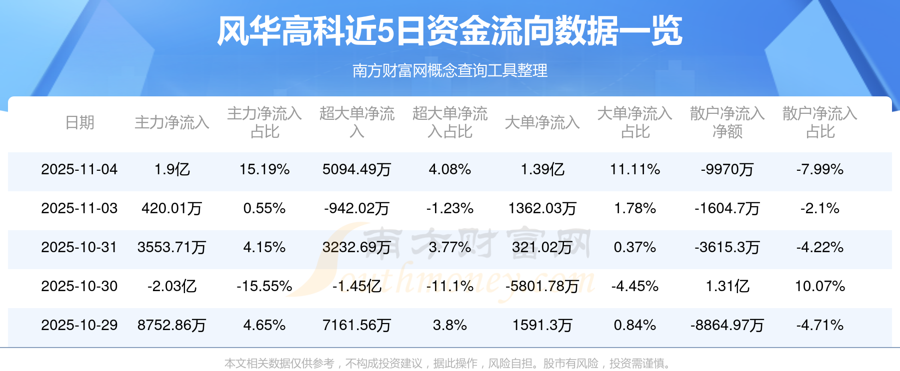 11月4日消息,风华高科11月4日主力净流入1.9亿元,超大单净流入5094.49万元,大单净流入1.39亿元,散户净流出9970万元。