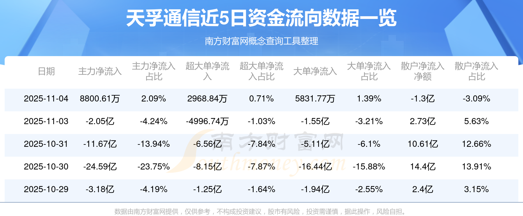 11月4日消息,天孚通信主力资金净流入8800.61万元,超大单资金净流入2968.84万元,散户资金净流出1.3亿元。