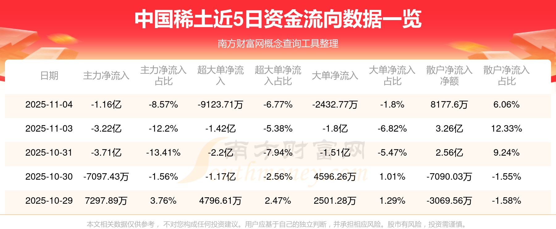 11月4日消息,中国稀土资金净流出1.16亿元,超大单资金净流出9123.71万元,换手率2.55%,成交金额13.48亿元。