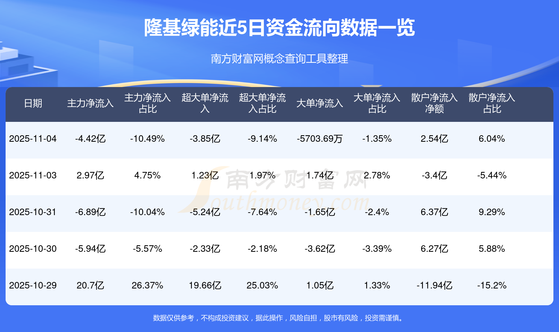 11月4日消息,隆基绿能主力资金净流出4.42亿元,超大单资金净流出3.85亿元,散户资金净流入2.54亿元。