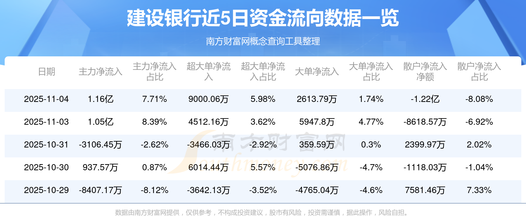 11月4日消息,建设银行主力资金净流入1.16亿元,超大单资金净流入9000.06万元,散户资金净流出1.22亿元。