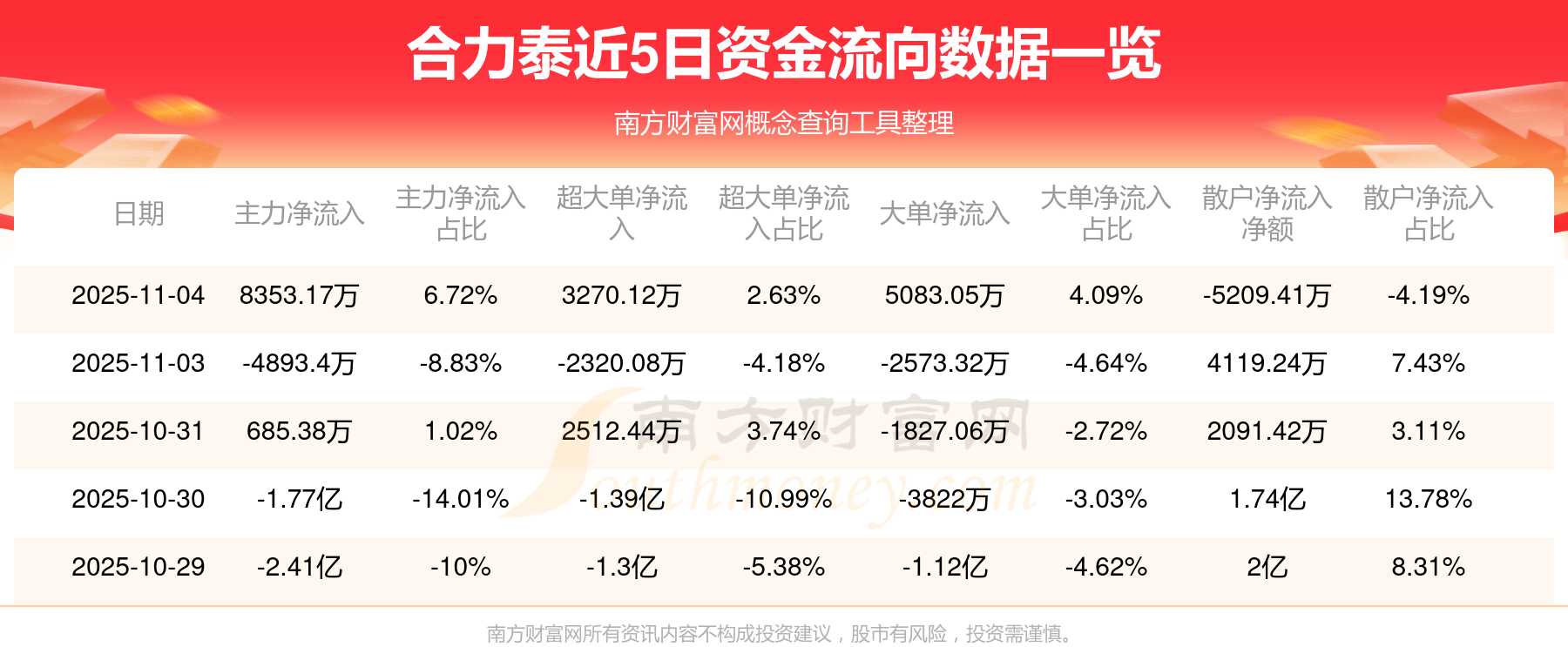 11月4日消息,合力泰11月4日主力资金净流入8353.17万元,超大单资金净流入3270.12万元,大单资金净流入5083.05万元,散户资金净流出5209.41万元。