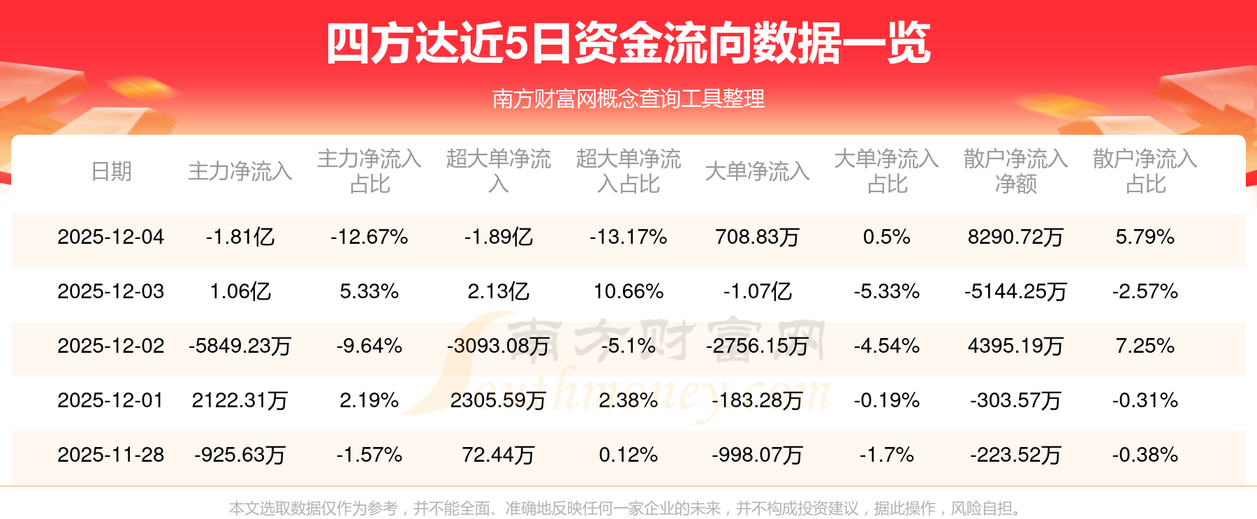 12月4日消息,四方达主力净流出1.81亿元,超大单净流出1.89亿元,散户净流入8290.72万元。