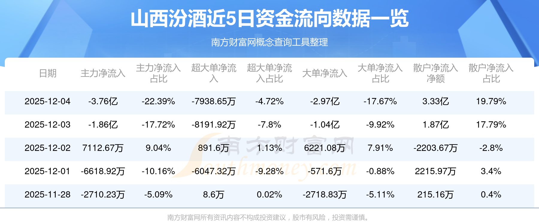 12月4日消息,山西汾酒主力资金净流出3.76亿元,超大单资金净流出7938.65万元,散户资金净流入3.33亿元。