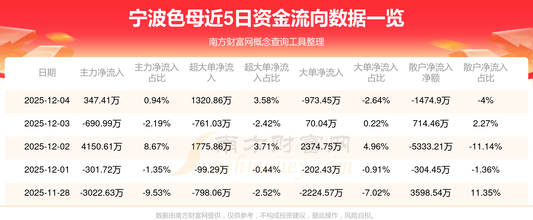 12月4日消息,宁波色母主力净流入347.41万元,超大单净流入1320.86万元,散户净流出1474.9万元。