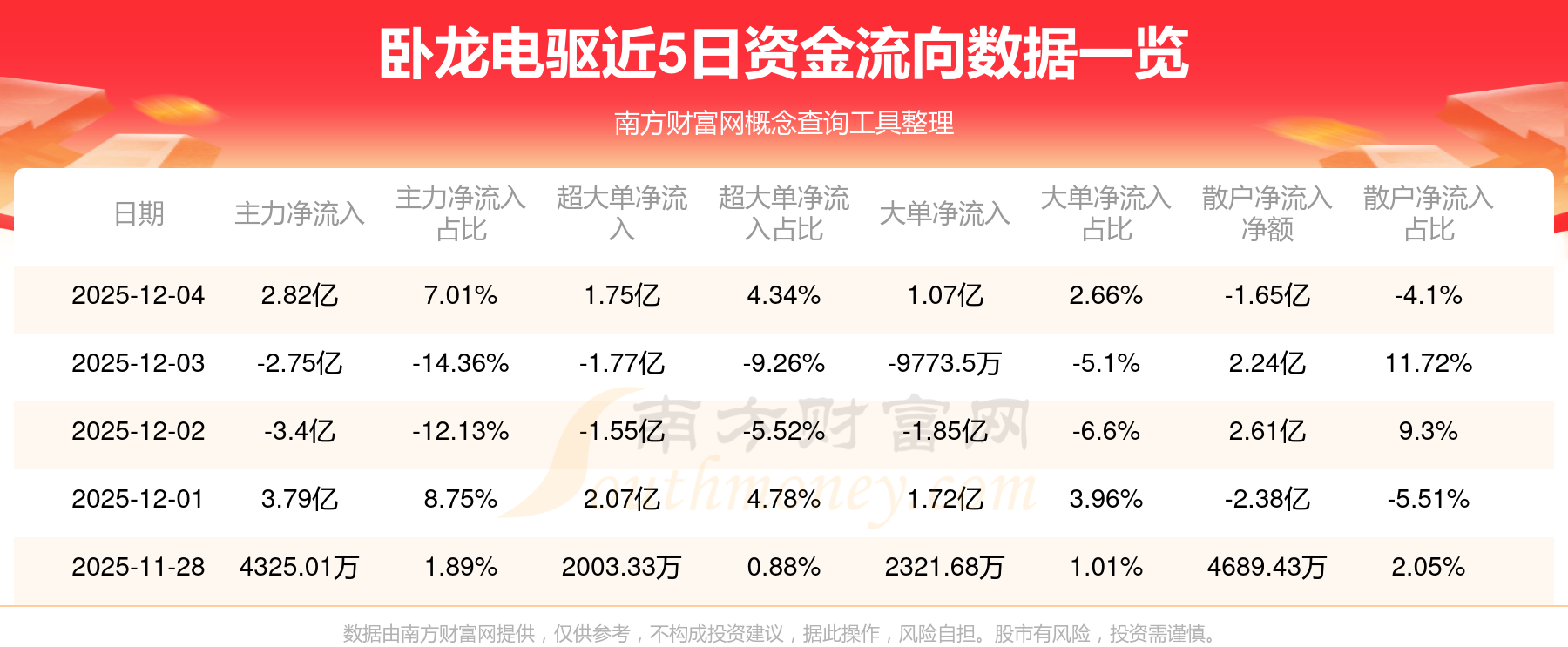 12月4日消息,卧龙电驱资金净流入2.82亿元,超大单资金净流入1.75亿元,换手率6.11%,成交金额40.22亿元。