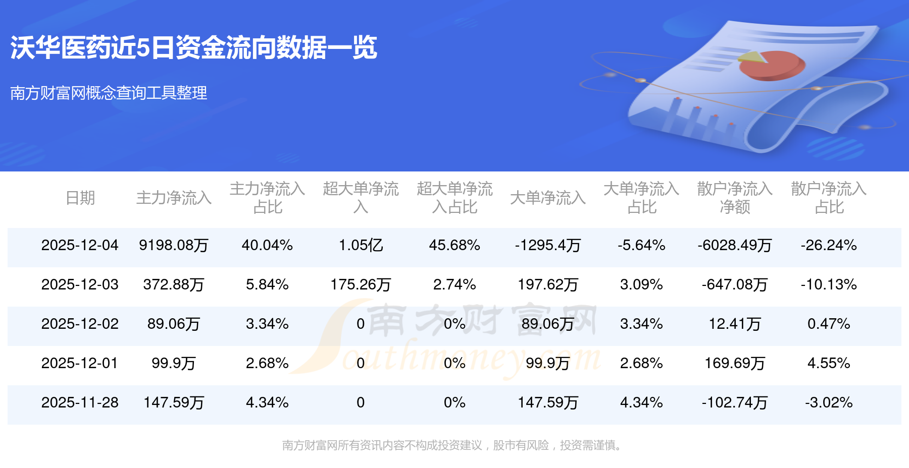 12月4日消息,沃华医药主力净流入9198.08万元,超大单净流入1.05亿元,散户净流出6028.49万元。