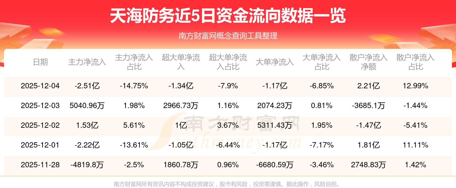 12月4日消息,天海防务主力资金净流出2.51亿元,超大单资金净流出1.34亿元,散户资金净流入2.21亿元。