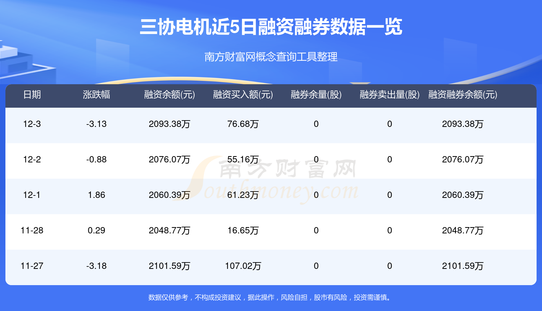 三协电机12月3日融券信息显示,融资方面,当日融资买入76.68万元,融资偿还59.37万元,融资净买额17.31万元。