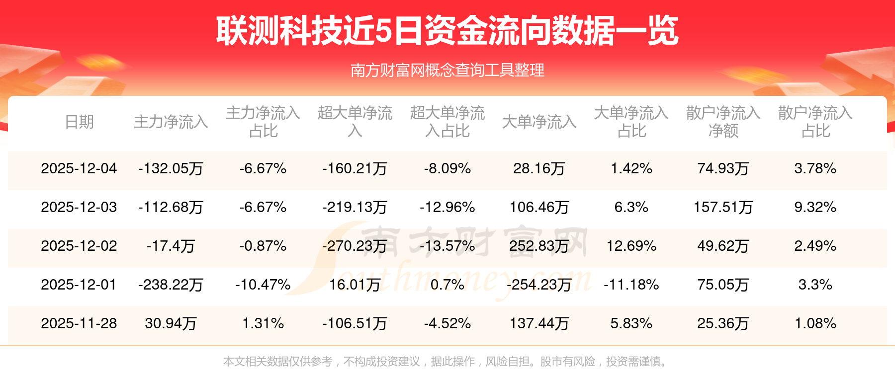 12月4日消息,联测科技12月4日主力净流出132.05万元,超大单净流出160.21万元,大单净流入28.16万元,散户净流入74.93万元。