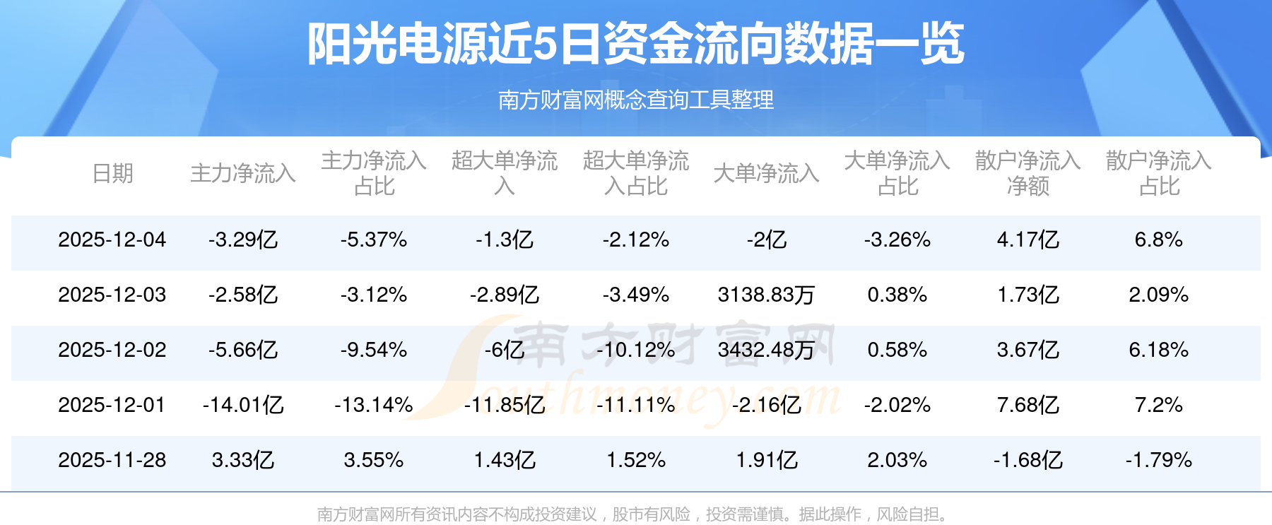 12月4日消息,阳光电源12月4日主力资金净流出3.29亿元,超大单资金净流出1.3亿元,大单资金净流出2亿元,散户资金净流入4.17亿元。