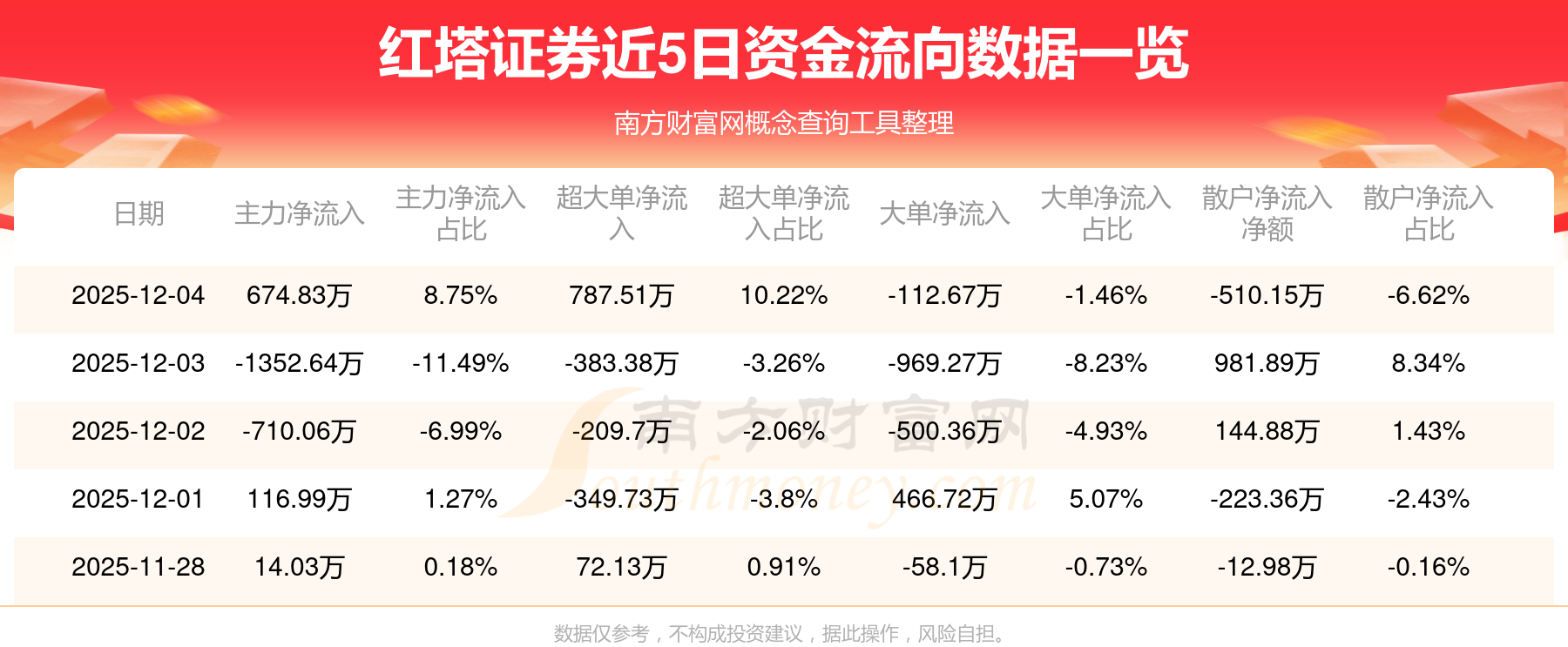 12月4日消息,红塔证券主力资金净流入674.83万元,超大单资金净流入787.51万元,散户资金净流出510.15万元。