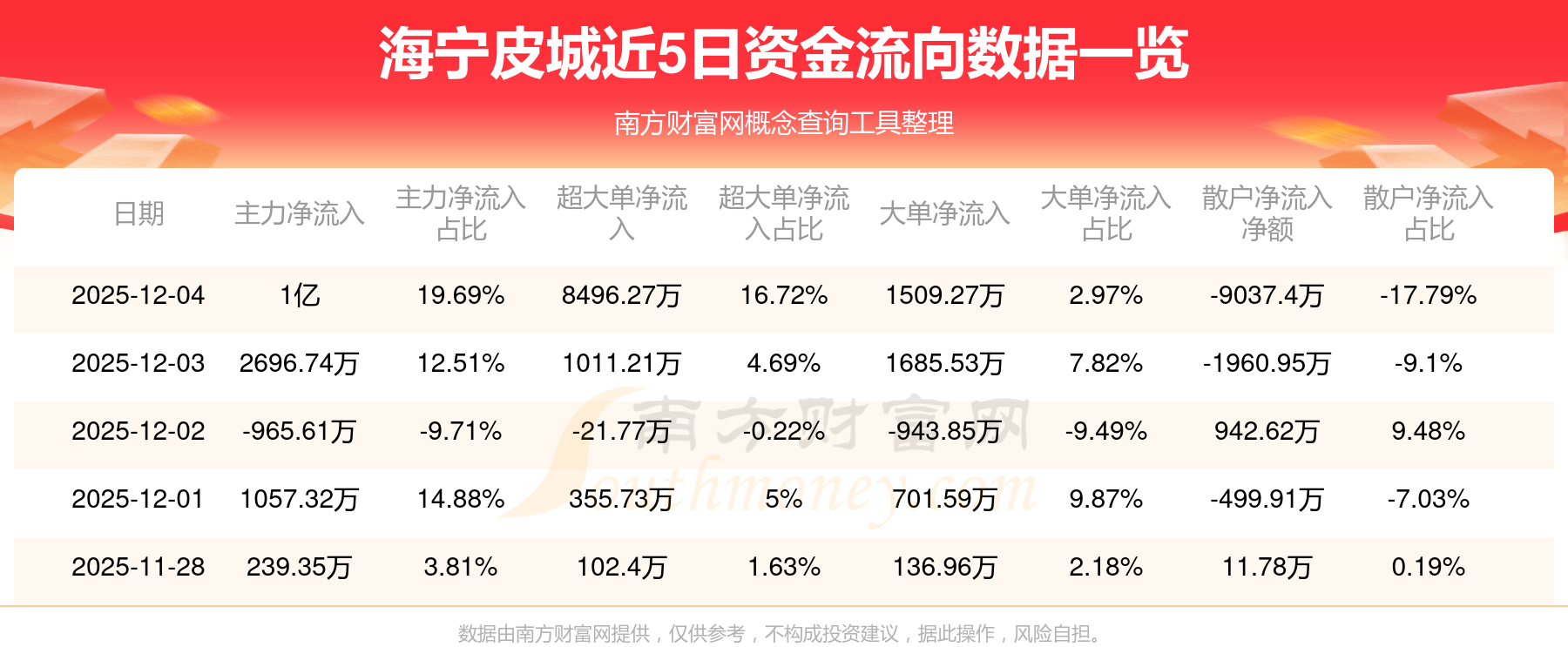 12月4日消息,海宁皮城12月4日主力资金净流入1亿元,超大单资金净流入8496.27万元,大单资金净流入1509.27万元,散户资金净流出9037.4万元。
