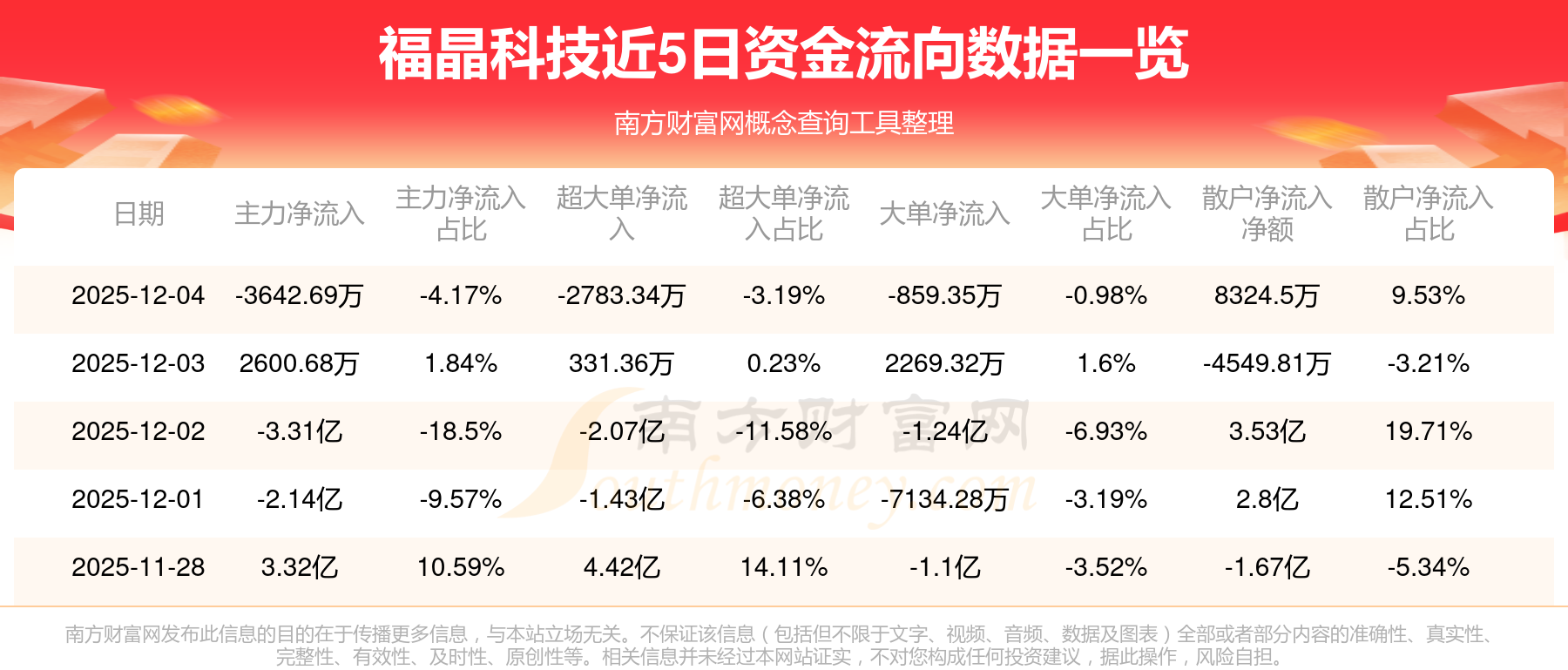 12月4日消息,福晶科技主力净流出3642.69万元,超大单净流出2783.34万元,散户净流入8324.5万元。