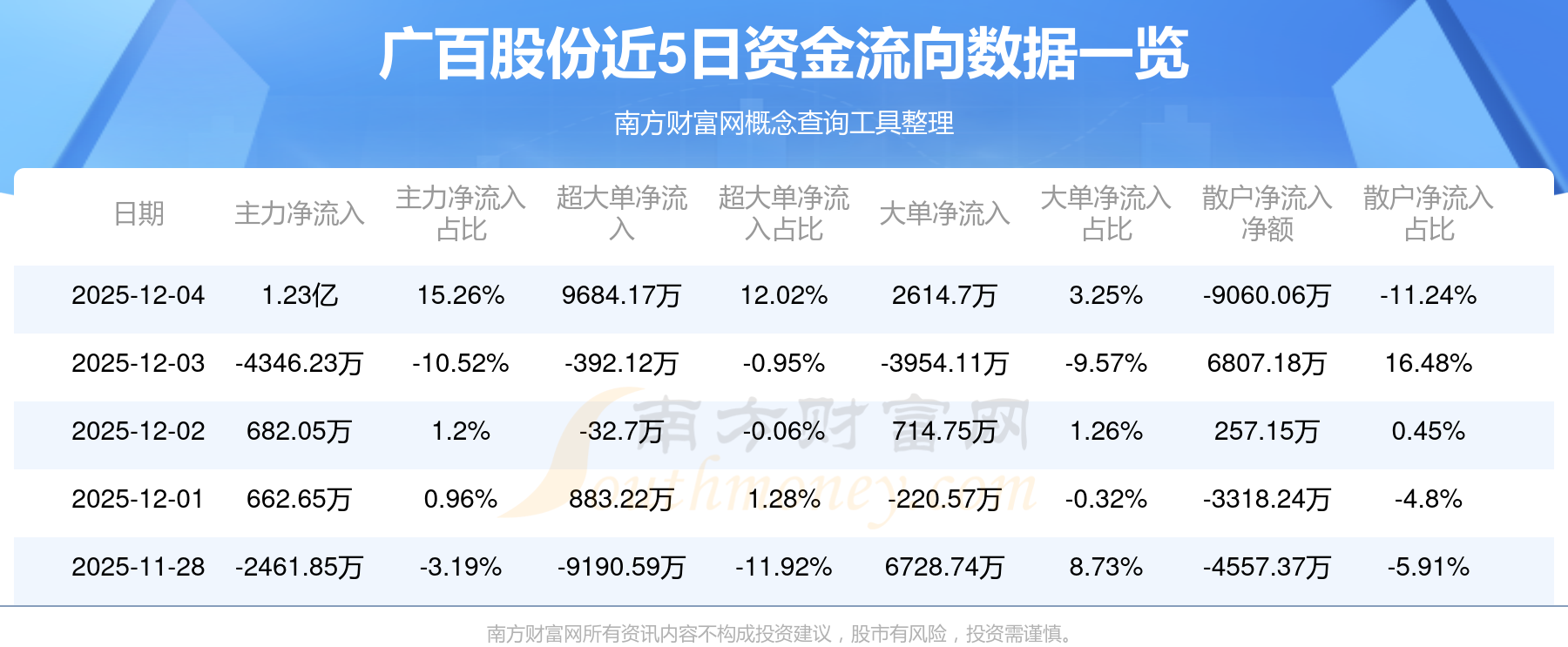 12月4日消息,广百股份主力净流入1.23亿元,超大单净流入9684.17万元,散户净流出9060.06万元。