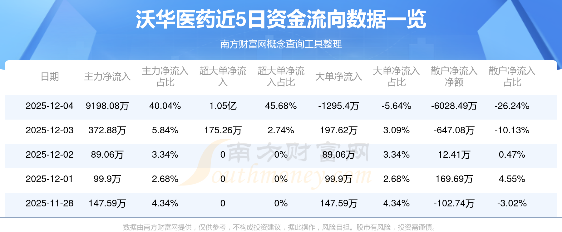 12月4日消息,沃华医药12月4日主力净流入9198.08万元,超大单净流入1.05亿元,大单净流出1295.4万元,散户净流出6028.49万元。