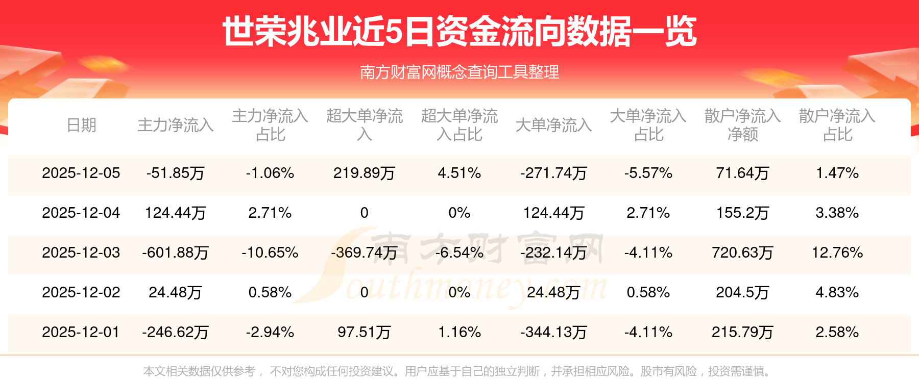 12月5日消息,世荣兆业资金净流出51.85万元,超大单资金净流入219.89万元,换手率0.96%,成交金额4879.31万元。