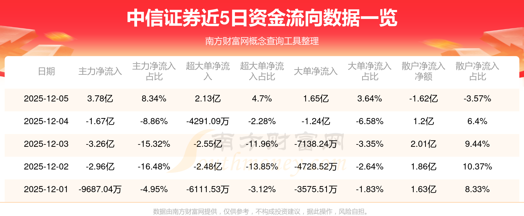 12月5日消息,中信证券主力资金净流入3.78亿元,超大单资金净流入2.13亿元,散户资金净流出1.62亿元。