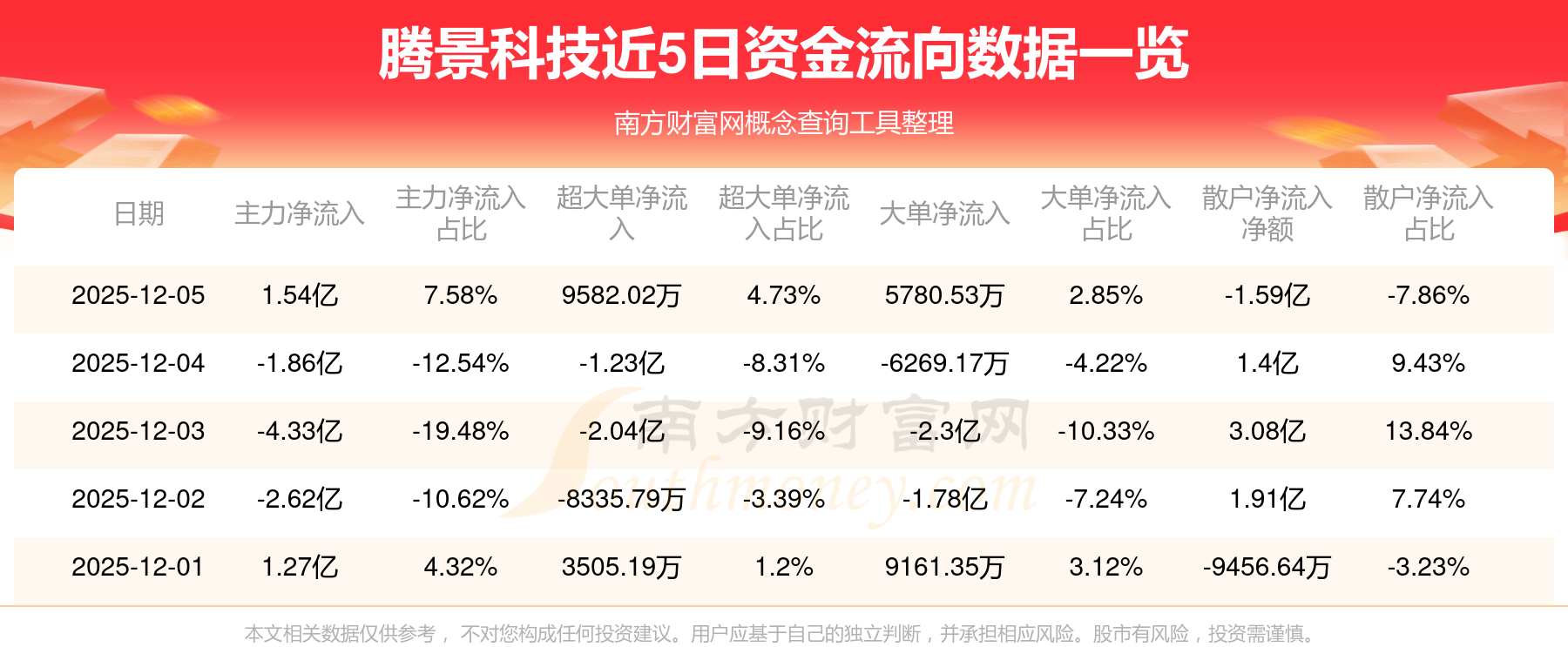 12月5日消息,腾景科技资金净流入1.54亿元,超大单资金净流入9582.02万元,换手率9.62%,成交金额20.28亿元。