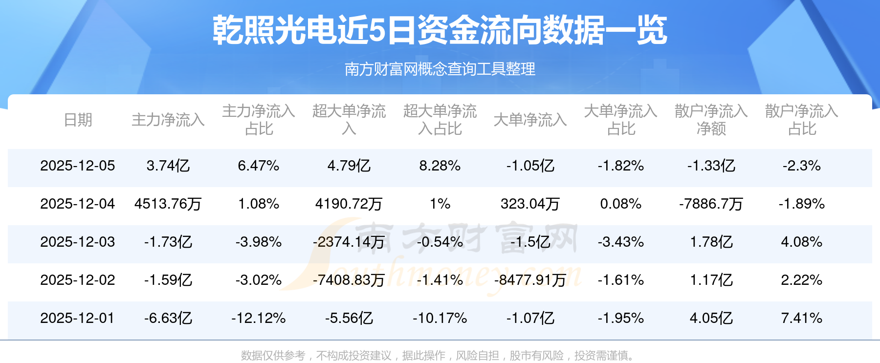 12月5日消息,乾照光电主力资金净流入3.74亿元,超大单资金净流入4.79亿元,散户资金净流出1.33亿元。