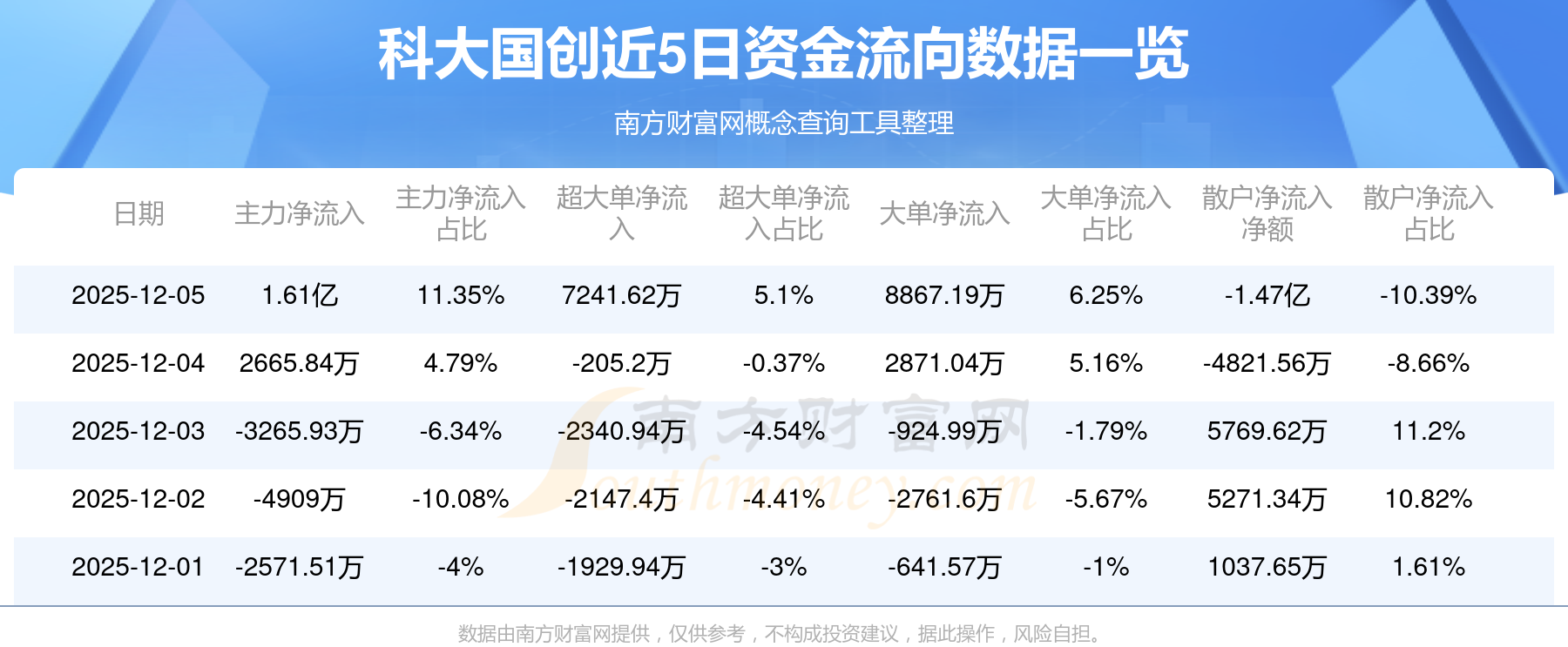 12月5日消息,科大国创12月5日主力净流入1.61亿元,超大单净流入7241.62万元,大单净流入8867.19万元,散户净流出1.47亿元。