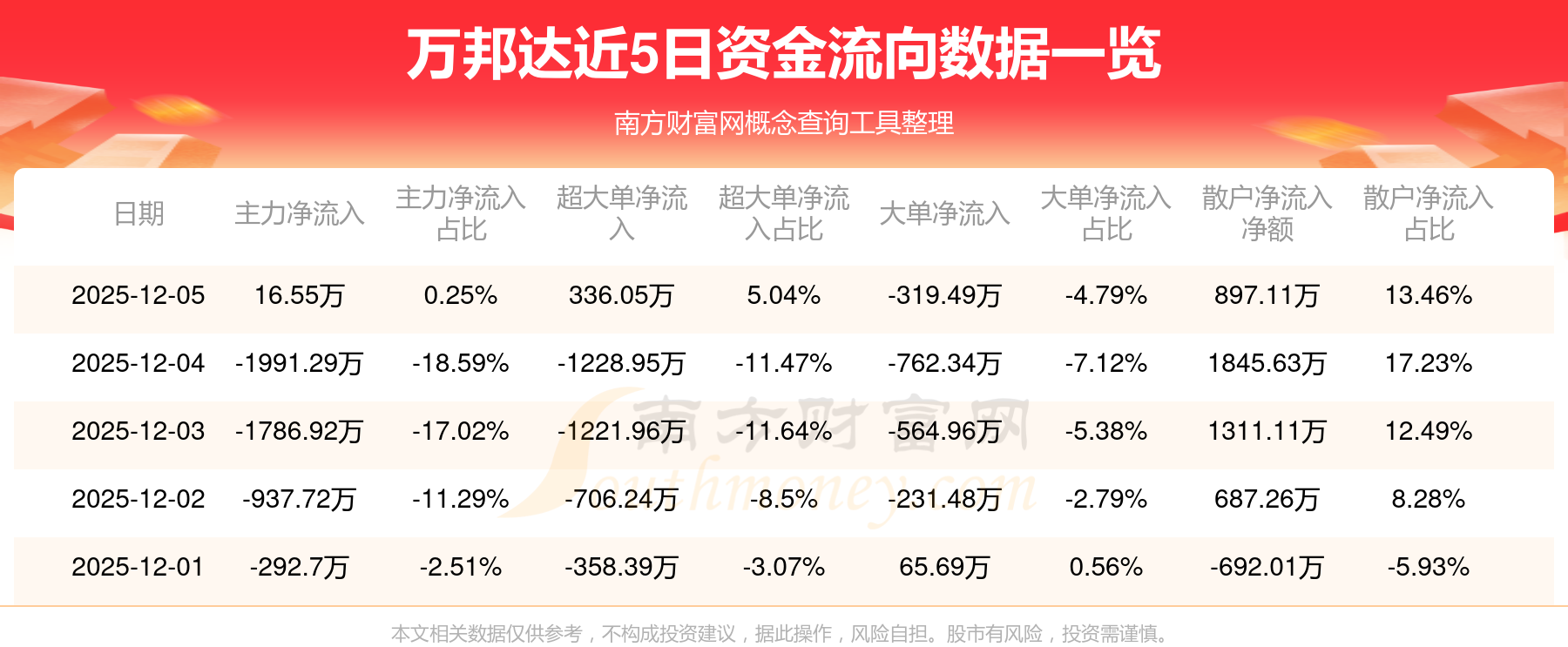 12月5日消息,万邦达主力资金净流入16.55万元,超大单资金净流入336.05万元,散户资金净流入897.11万元。