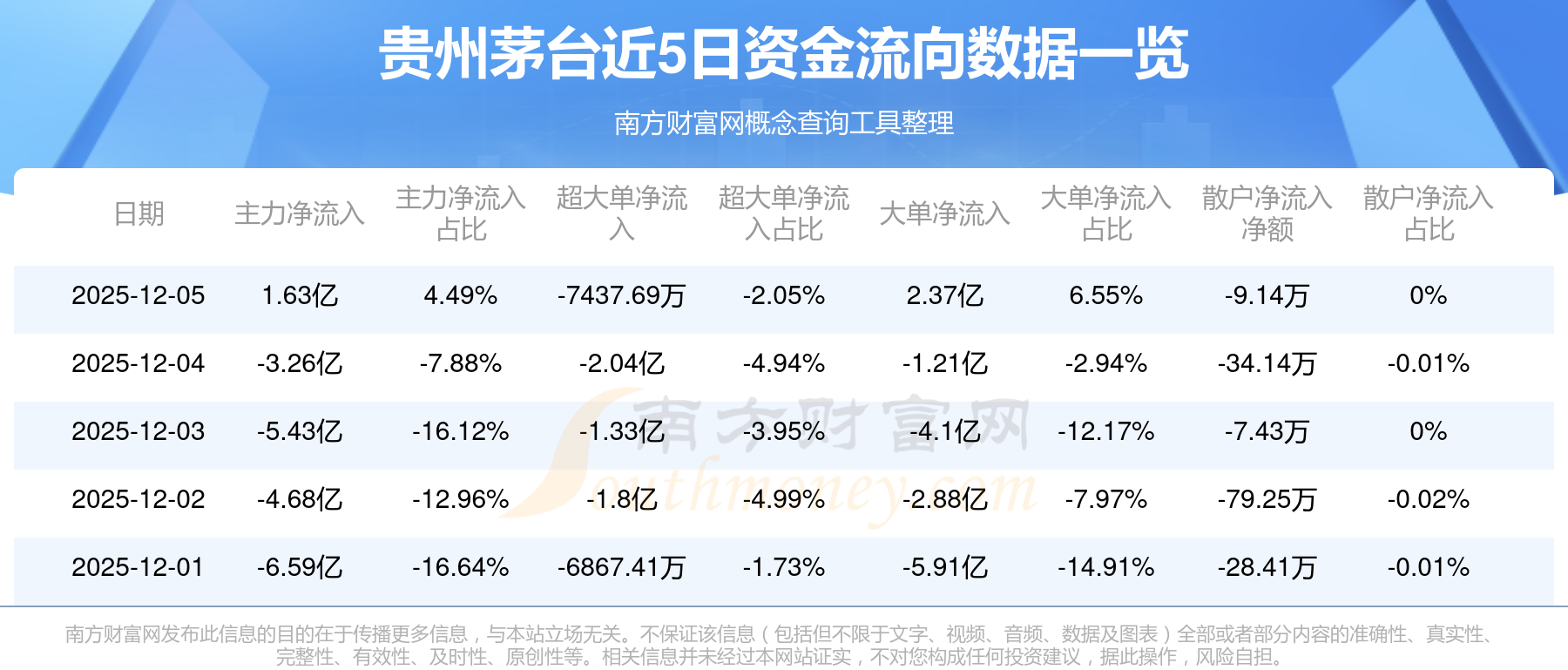 12月5日消息,贵州茅台主力资金净流入1.63亿元,超大单资金净流出7437.69万元,散户资金净流出9.14万元。