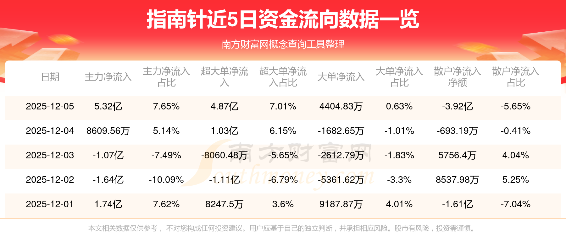 资金流向数据方面,12月5日主力资金净流流入5.32亿元,超大单资金净流入4.87亿元,大单资金净流入4404.83万元,散户资金净流出3.92亿元。