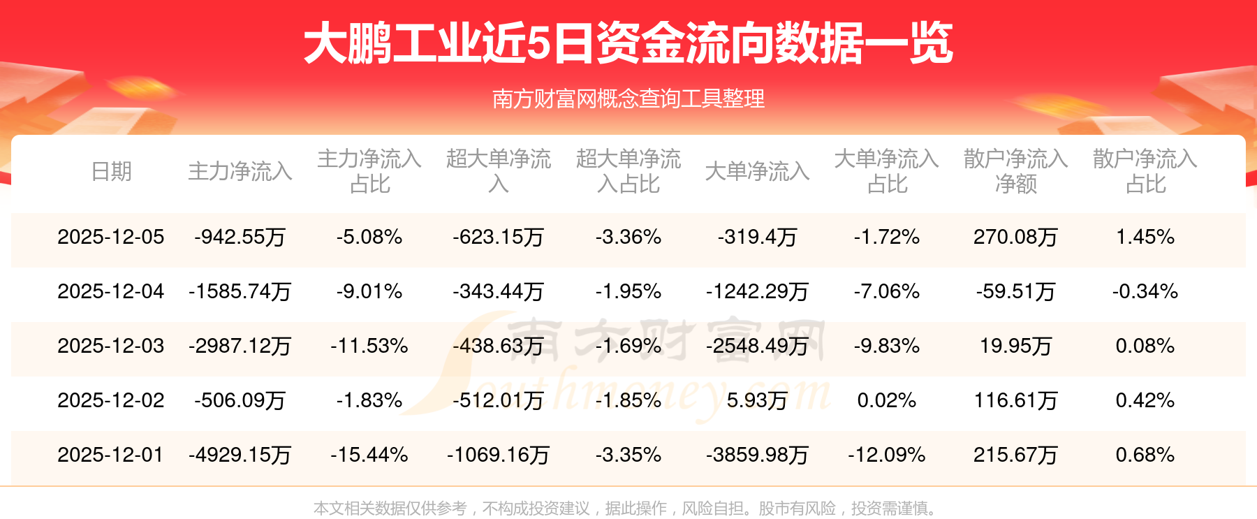 12月5日该股主力净入-942.55万元,其中资金流入方面:超大单净入561.15万元,大单净入3265.3万元,中单净入3353.15万元,散户净入1133.35万元;资金流出方面:超大单净出1184.3万元,大单净出3584.7万元,中单净出3547.41万元,散户净出863.27万元。