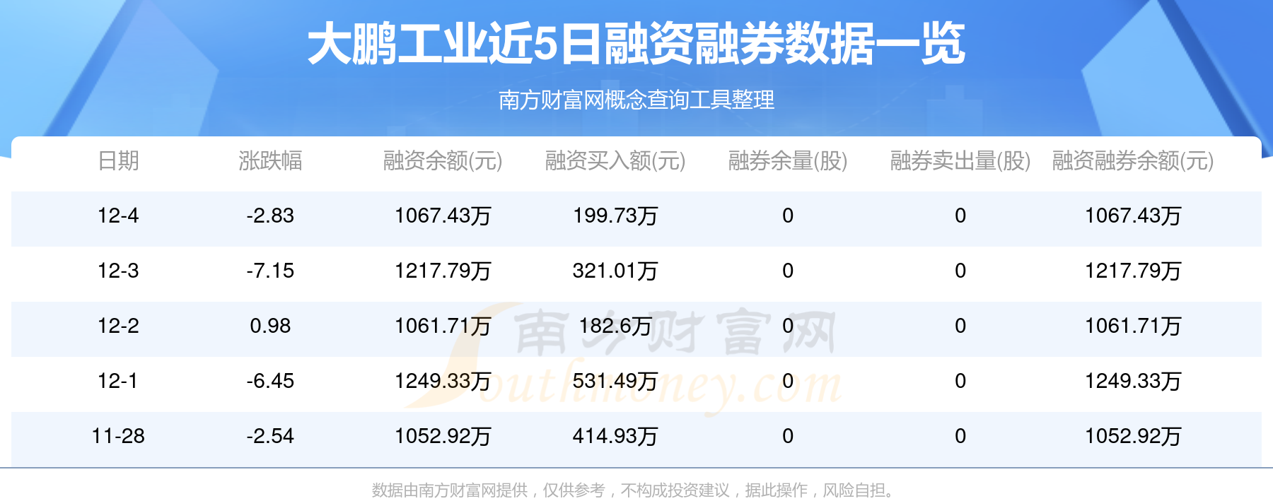 大鹏工业12月4日融券信息显示,融资方面,当日融资买入199.73万元,融资偿还350.09万元,融资净买额-150.36万元。近5日融资融券数据一览见下表: