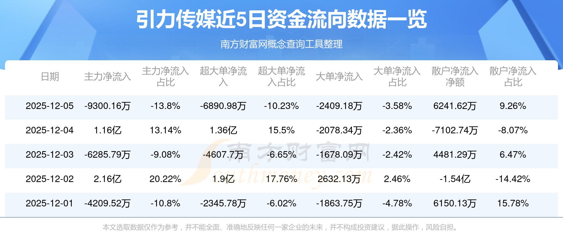 12月5日消息,引力传媒12月5日主力净流出9300.16万元,超大单净流出6890.98万元,大单净流出2409.18万元,散户净流入6241.62万元。