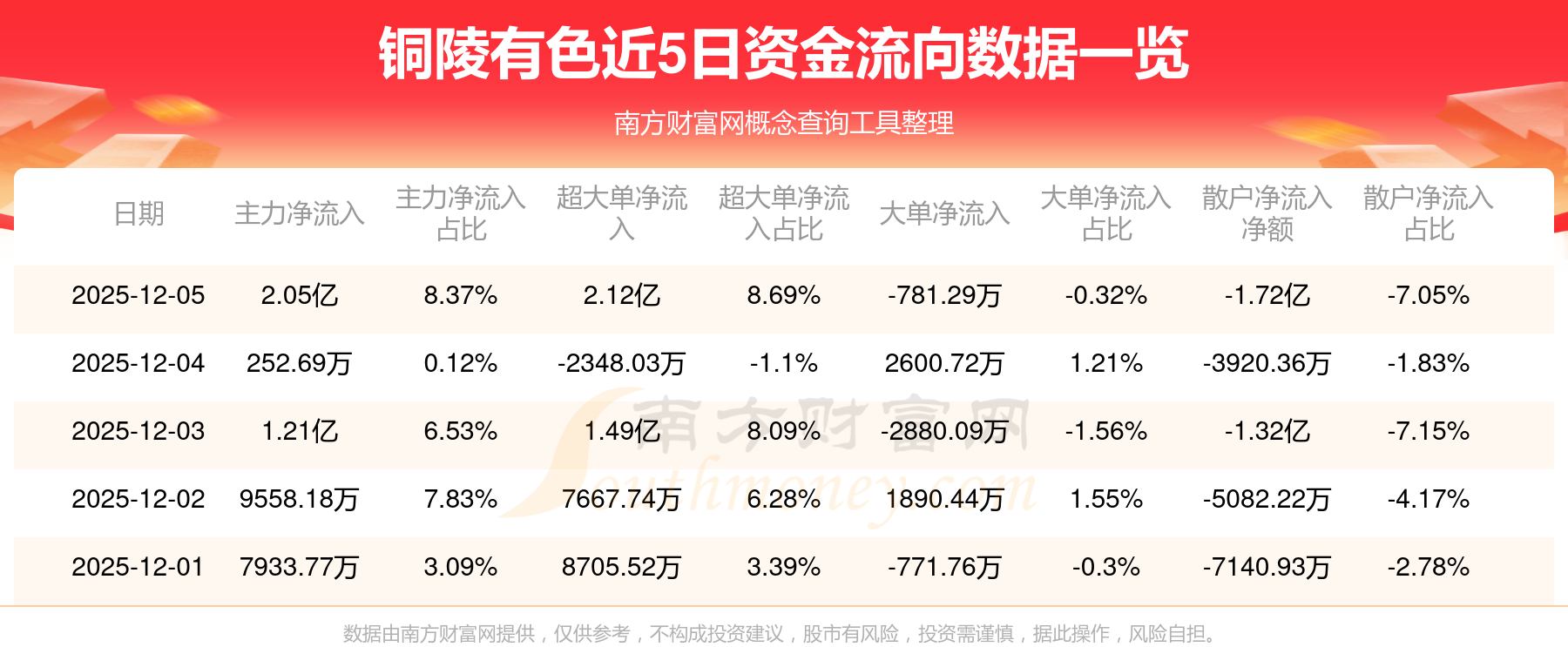 12月5日消息,铜陵有色主力资金净流入2.05亿元,超大单资金净流入2.12亿元,散户资金净流出1.72亿元。