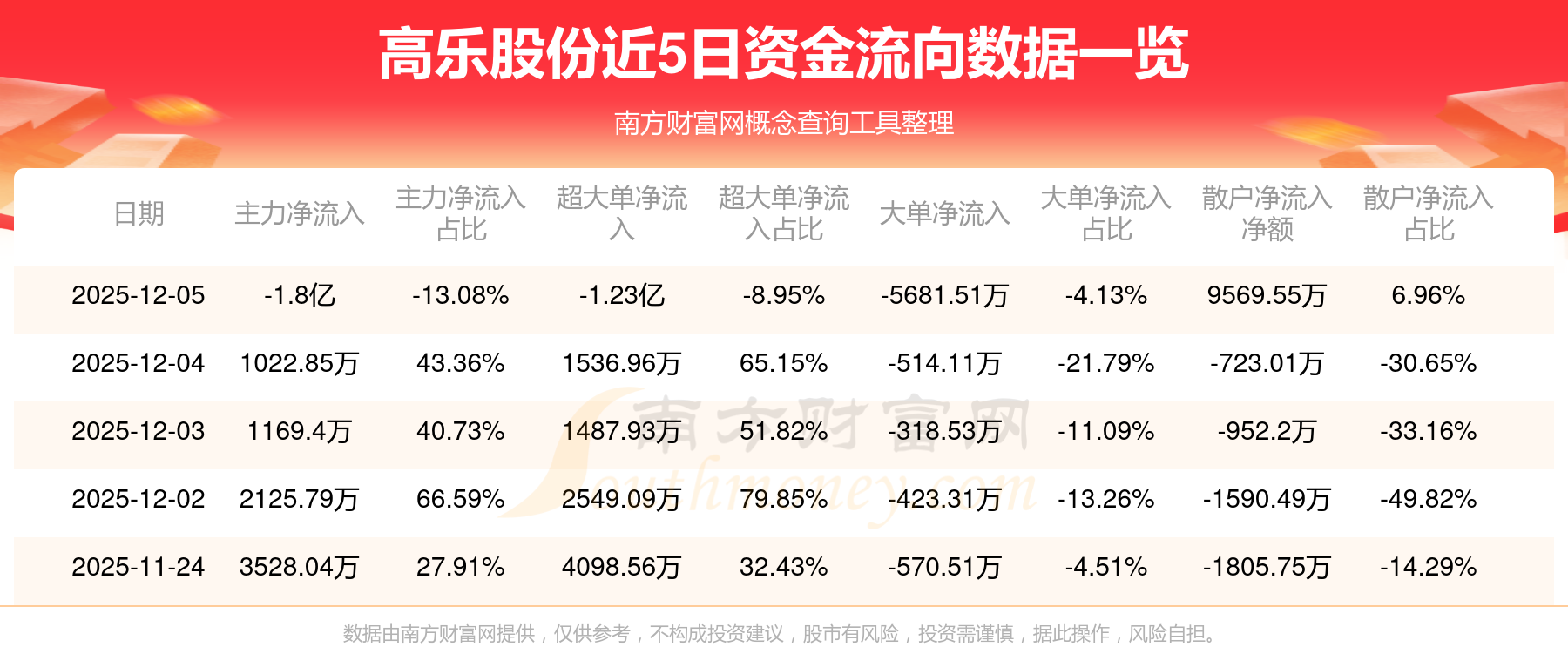 12月5日消息,高乐股份12月5日主力净流出1.8亿元,超大单净流出1.23亿元,大单净流出5681.51万元,散户净流入9569.55万元。