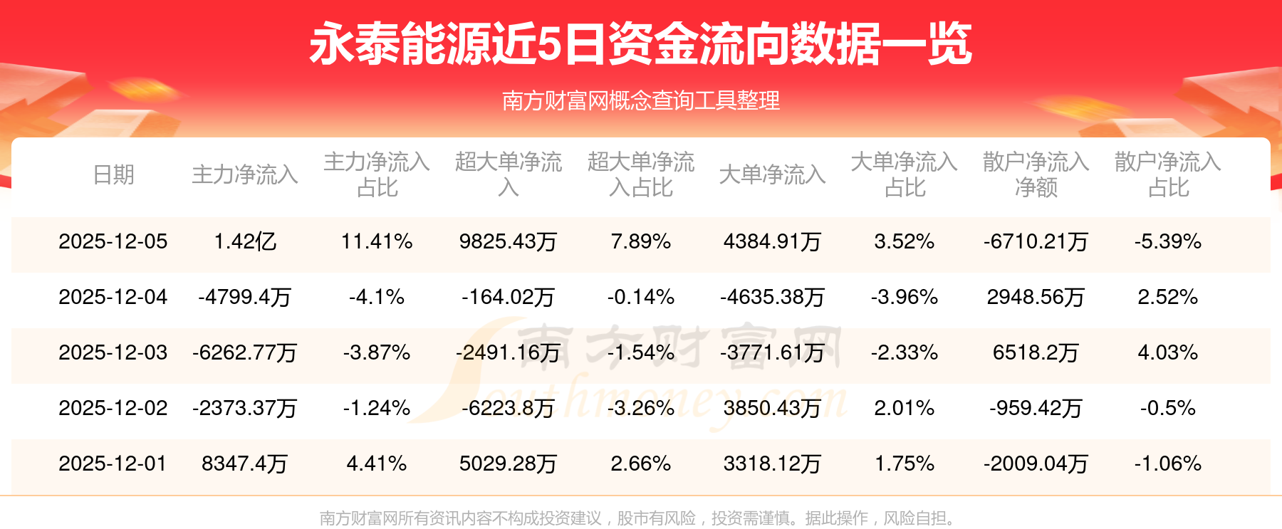 12月5日消息,永泰能源主力资金净流入1.42亿元,超大单资金净流入9825.43万元,散户资金净流出6710.21万元。
